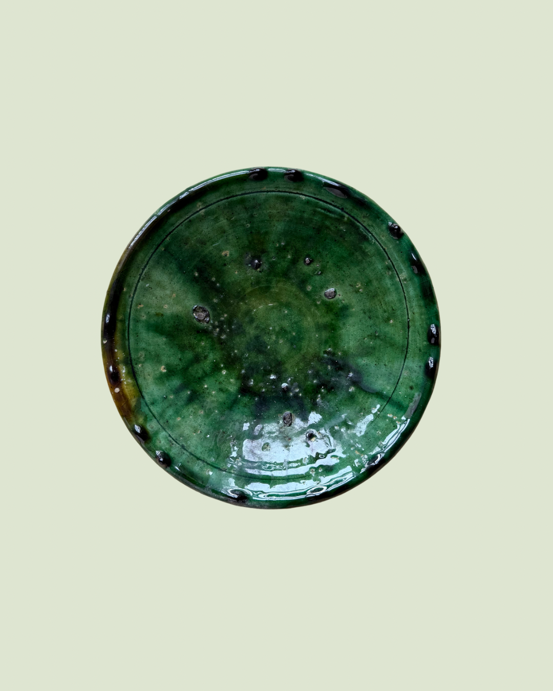 Apportez une note de raffinement et d’authenticité à vos repas avec cette magnifique assiette en terre cuite émaillée verte, fabriquée à la main dans le village réputé de Tamegroute, au sud du Maroc. Sa teinte verte vibrante, véritable reflet de l’artisanat local, transforme votre table en un espace convivial et chaleureux. Que ce soit pour vos repas quotidiens ou pour des occasions spéciales, cette assiette unique se démarque par sa beauté artisanale, chaque pièce étant méticuleusement façonnée à la main par des artisans expérimentés.