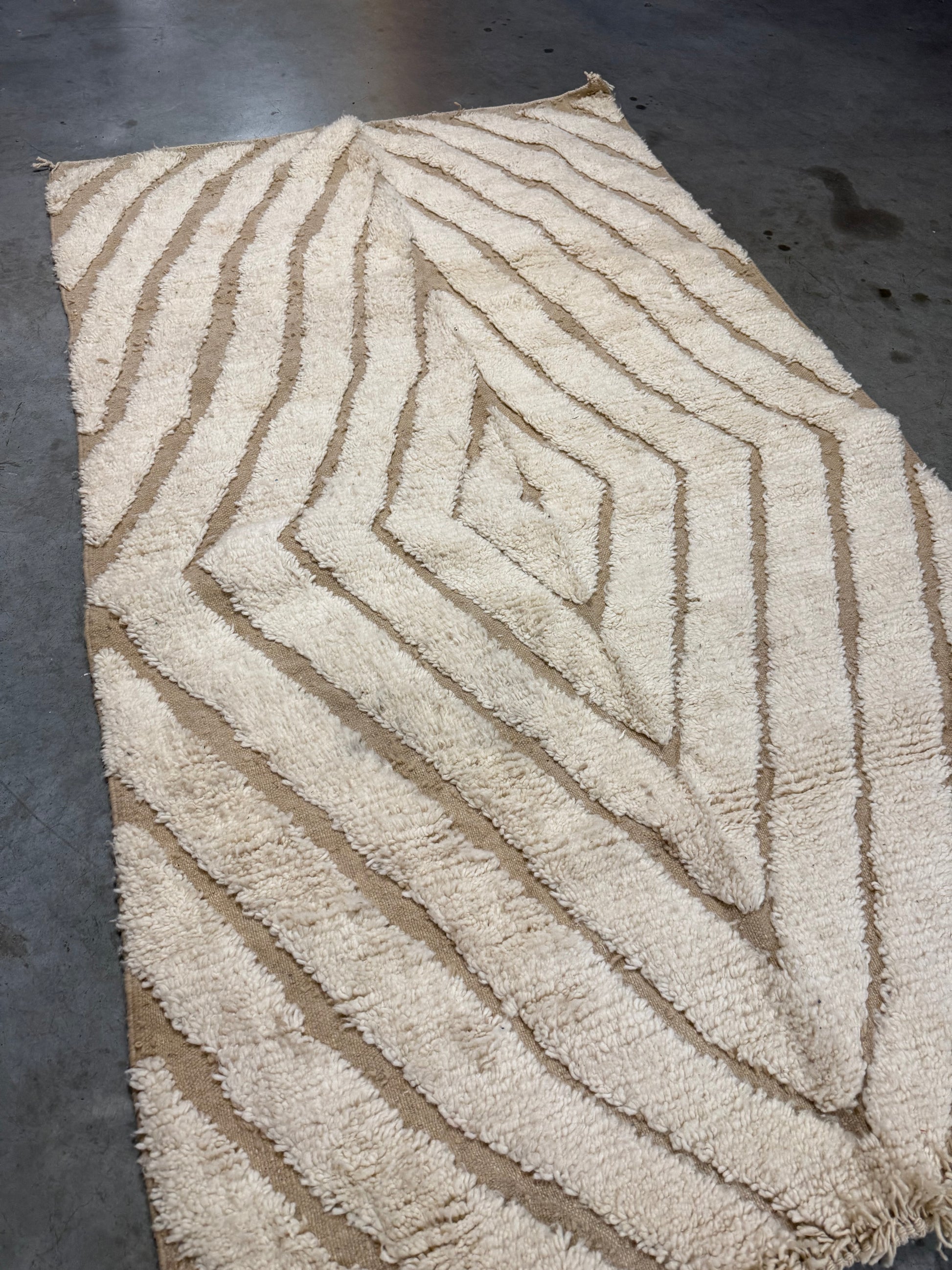 Découvrez ce magnifique tapis berbère Béni Ourain écru, une véritable pièce d'artisanat marocain.
